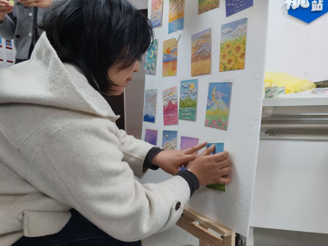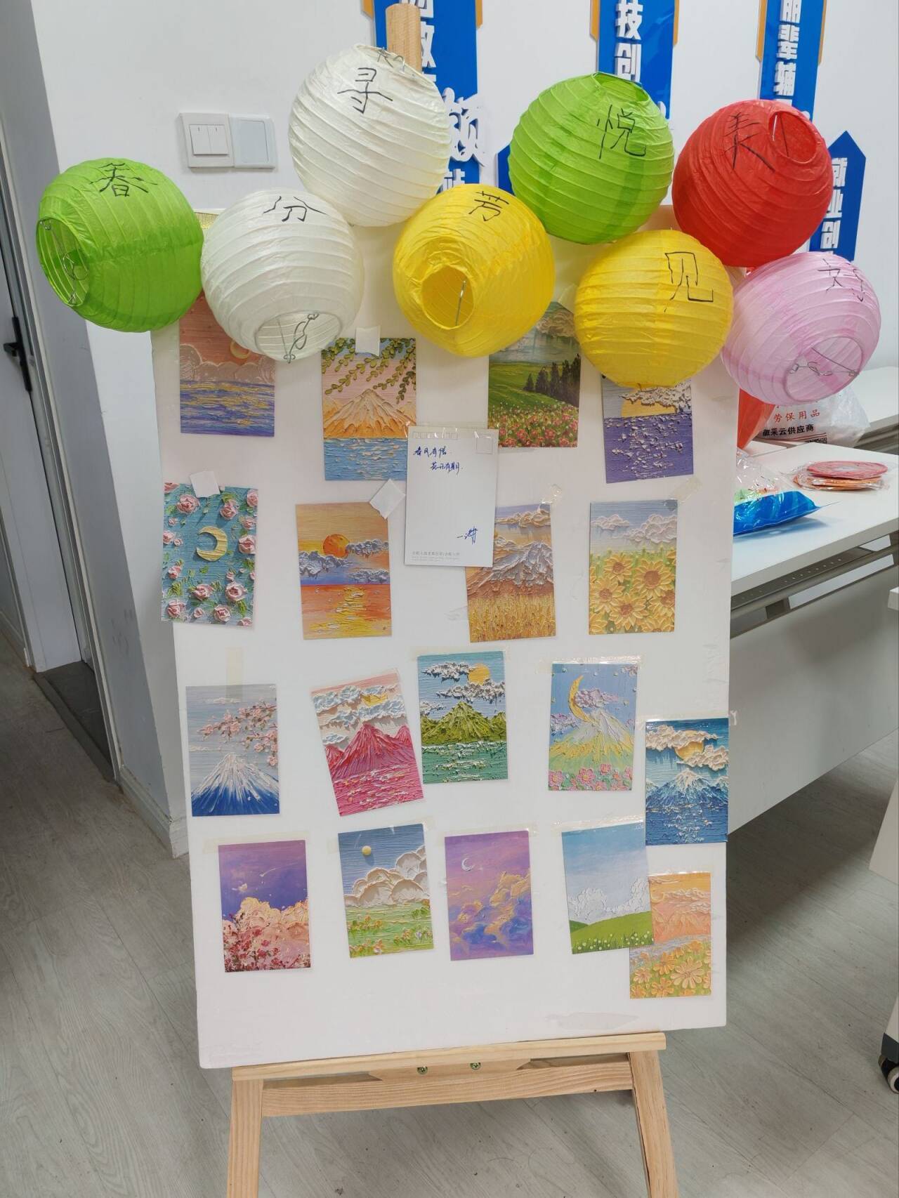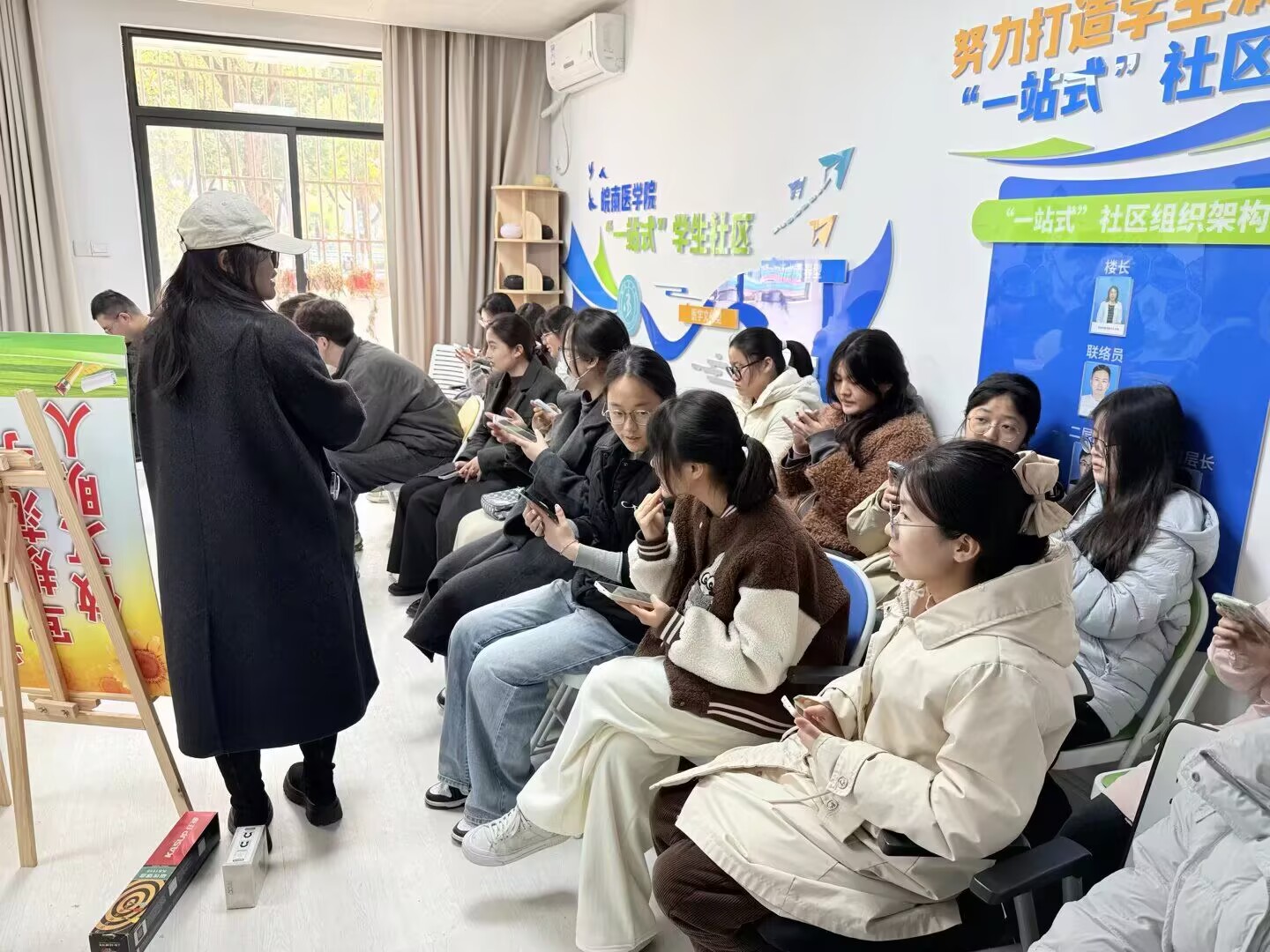 在打卡区前,同学们有序排队,耐心等候,彼此欣赏各自镜头下的美好。完成打卡后,大家不仅领取了学院定制的春日明信片与手工糕点,还在明信片上认真写下寄语——“春风拂面,万事顺遂”。一句句真挚的文字,寄托着同学们对未来的期许与对当下的珍视。同学们三三两两围坐,在糕点香气中放松身心,享受难得的午后闲暇时光。