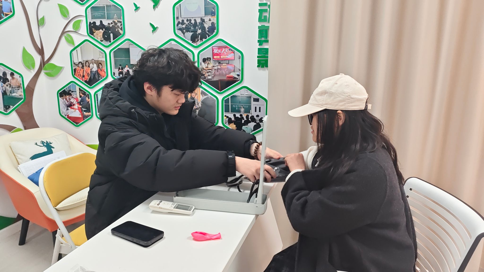 活动现场还特别设置了免费测量血压专区,由检验学院的学生志愿者提供服务。这一贴心的健康关怀举措,将专业知识与实践服务相结合,既为同学们提供了便捷的健康监测,也体现了学院的专业特色。志愿者们耐心细致地为大家讲解测量结果及日常保健小贴士,让春日的暖意不仅停留在味蕾,更浸润心田。