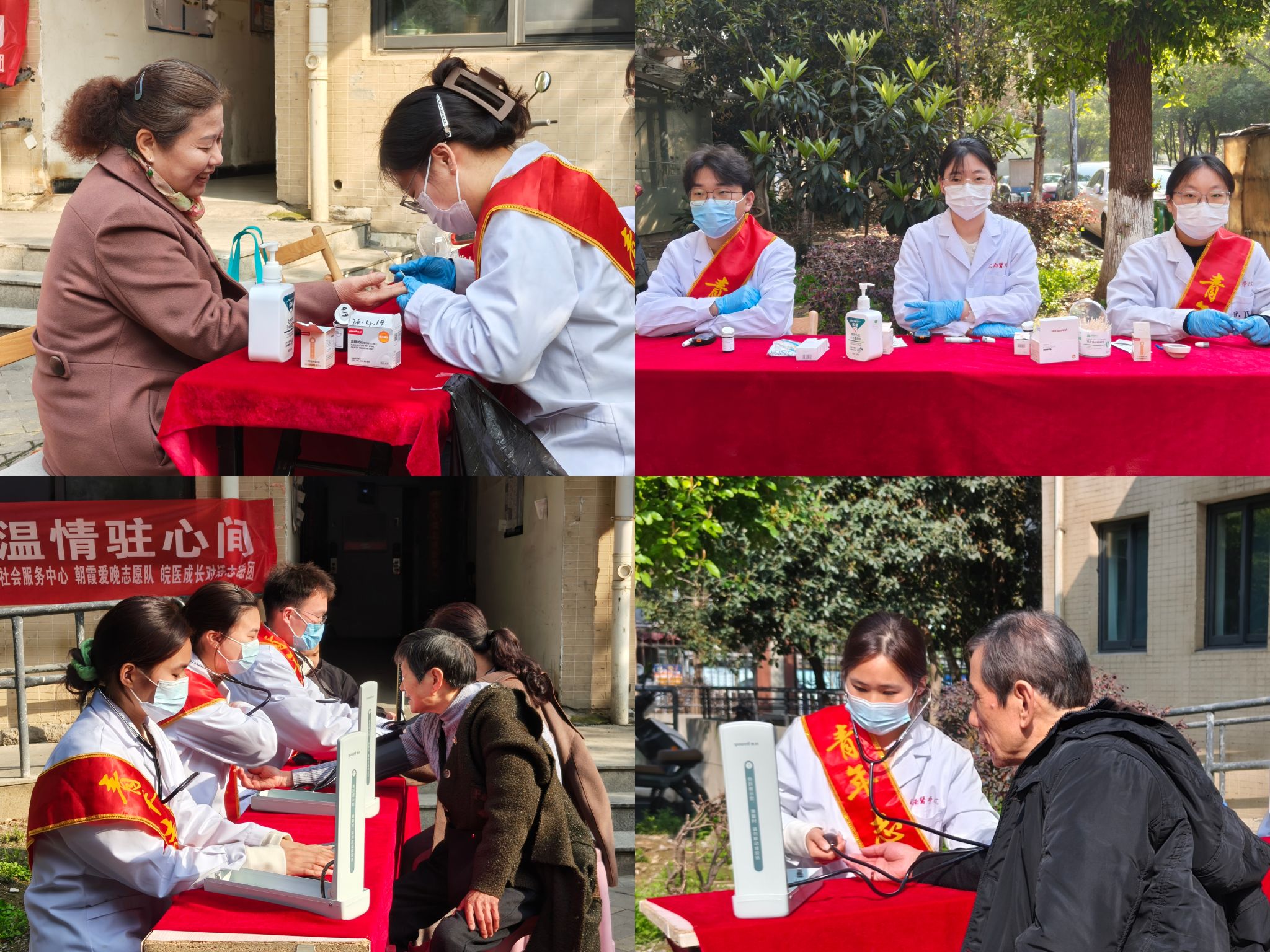 义诊环节中,志愿者为社区居民免费测量血压、血糖,耐心询问身体状况,细致解读检测结果,并针对老年人常见健康问题,讲解日常饮食、作息调理及慢病注意事项。志愿者以专业、温和的服务,让居民在家门口就能享受到便捷的健康检查,切实把健康关怀送到群众身边,拉近了青年学子与社区居民的距离。