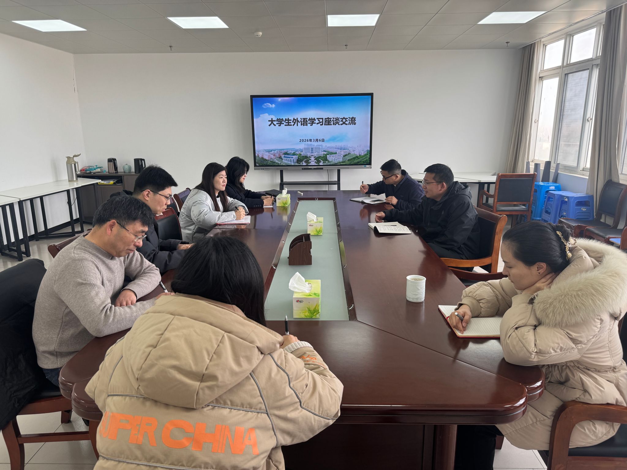 3月6日,人文与管理学院邀请公共基础学院外语教研室主任李东一行4人召开大学生英语学习座谈交流会。会上,学院简要介绍了学生整体情况以及在提高学生英语学习方面做的工作。外语教研室针对学生反馈的外语学习难点、疑点逐一解答,回应学生诉求,通报了学院大学生四六级考试整体成绩,分享了外语学习中的先进做法。