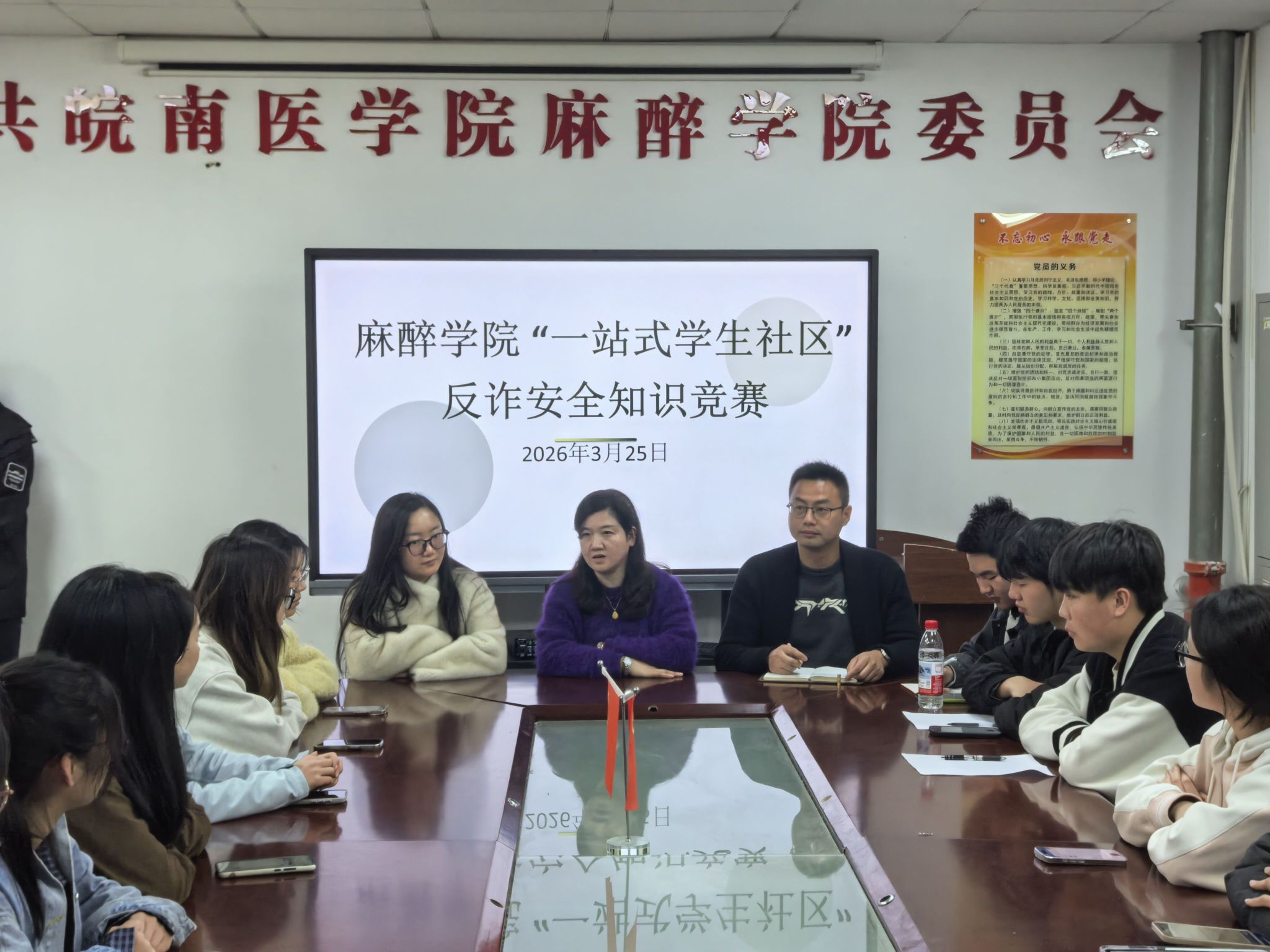 为进一步强化学生安全防范意识,3月25日,麻醉学院“一站式”学生社区举办反诈安全知识竞赛。学院副书记、团委负责人和辅导员带队组织,40余位学生积极参与,在趣味竞赛中学习安全知识,提升防范能力。