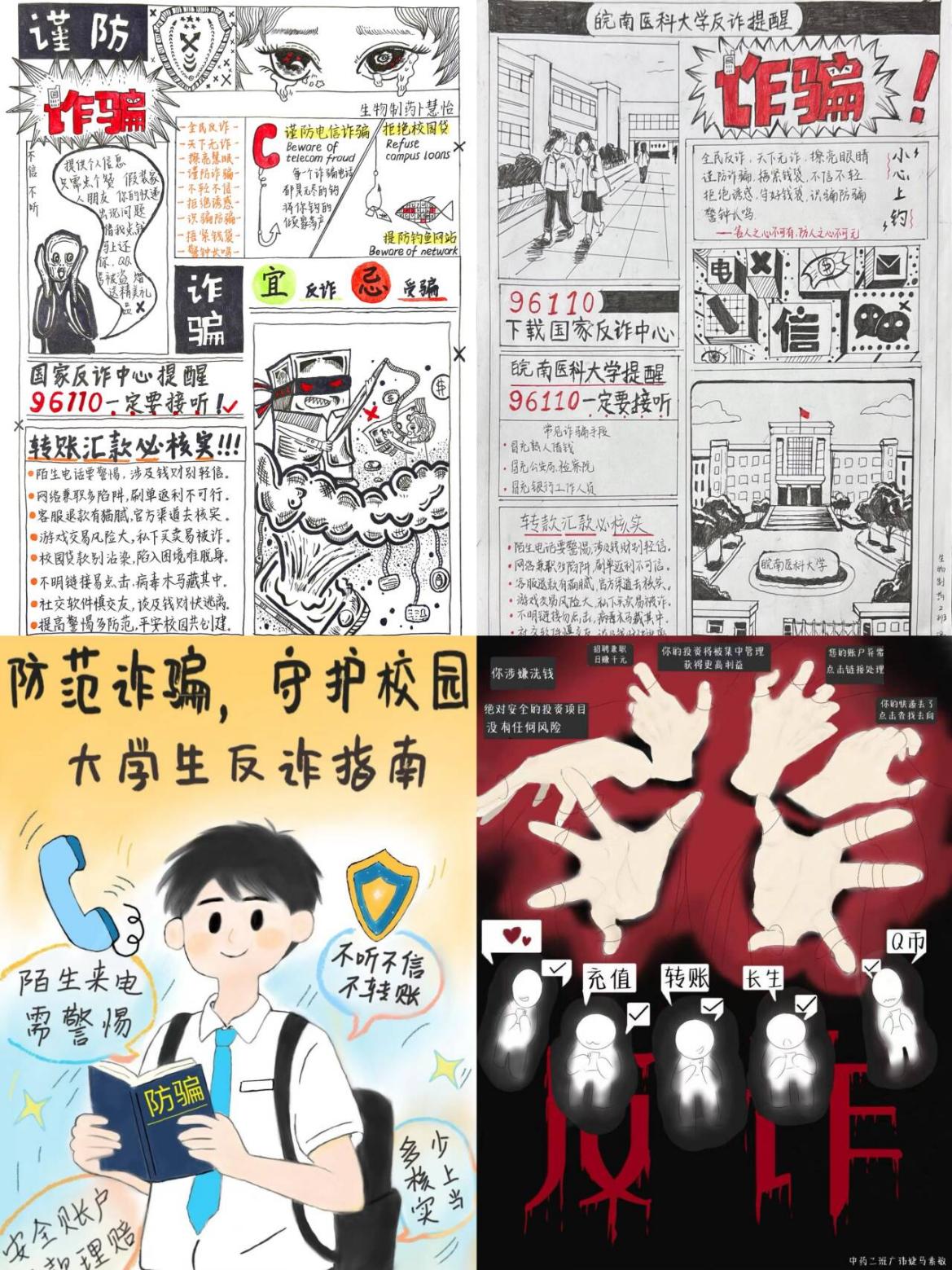 海报绘制,防诈宣传更生动。学院开展反诈宣传海报征集活动。同学们踊跃参与、精心创作,以手绘、电子设计等多样形式,将反诈知识、警示标语、典型陷阱融入绘画作品中。一张张主题鲜明、内容生动、创意新颖的宣传海报,吸引了更多的学生对反诈知识的关注和学习。