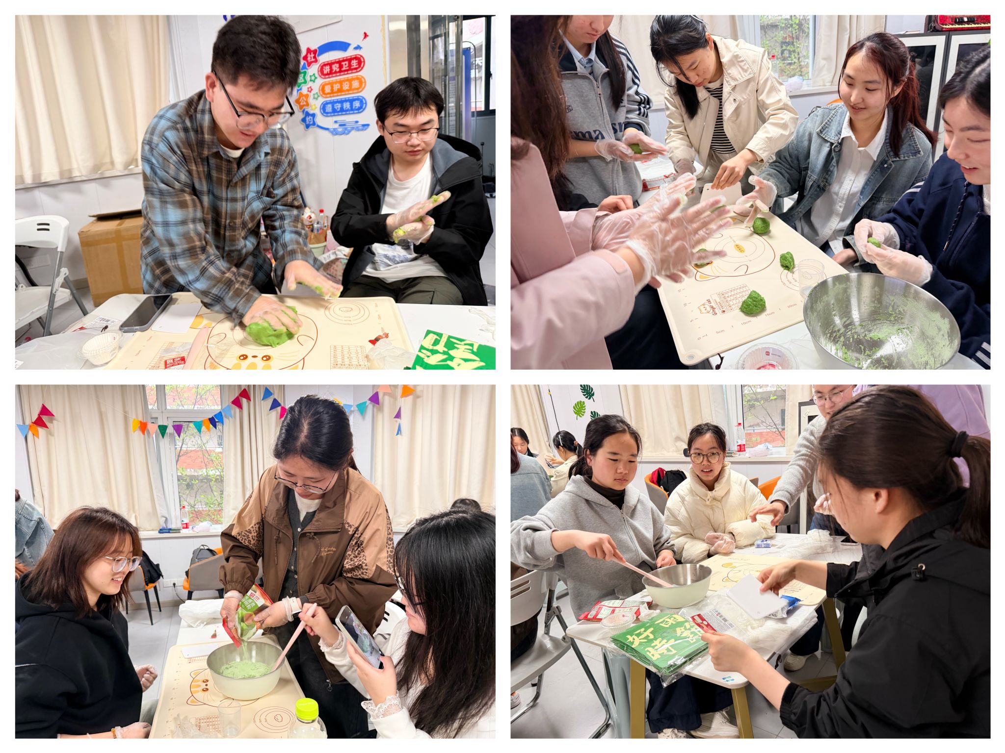 活动伊始,工作人员通过短片与现场讲解,生动科普青团的历史渊源、民俗寓意及制作工艺,从青汁提取、粉团配比到馅料调配、塑形蒸制,每一个环节都讲解细致。实操环节,现场氛围热烈有序。同学们挽袖俯身、分工协作,有的专注揉制青绿色面团,让其在掌心变得柔韧光滑;有的细心分割剂子,精准拿捏大小比例;有的手法娴熟地包裹豆沙、肉松等馅料,收口捏合间尽显匠心。大家相互交流经验,不时传来欢声笑语,一个个翠绿圆润的青团在众人手中诞生,春日的生机与传统的韵味交织弥漫。