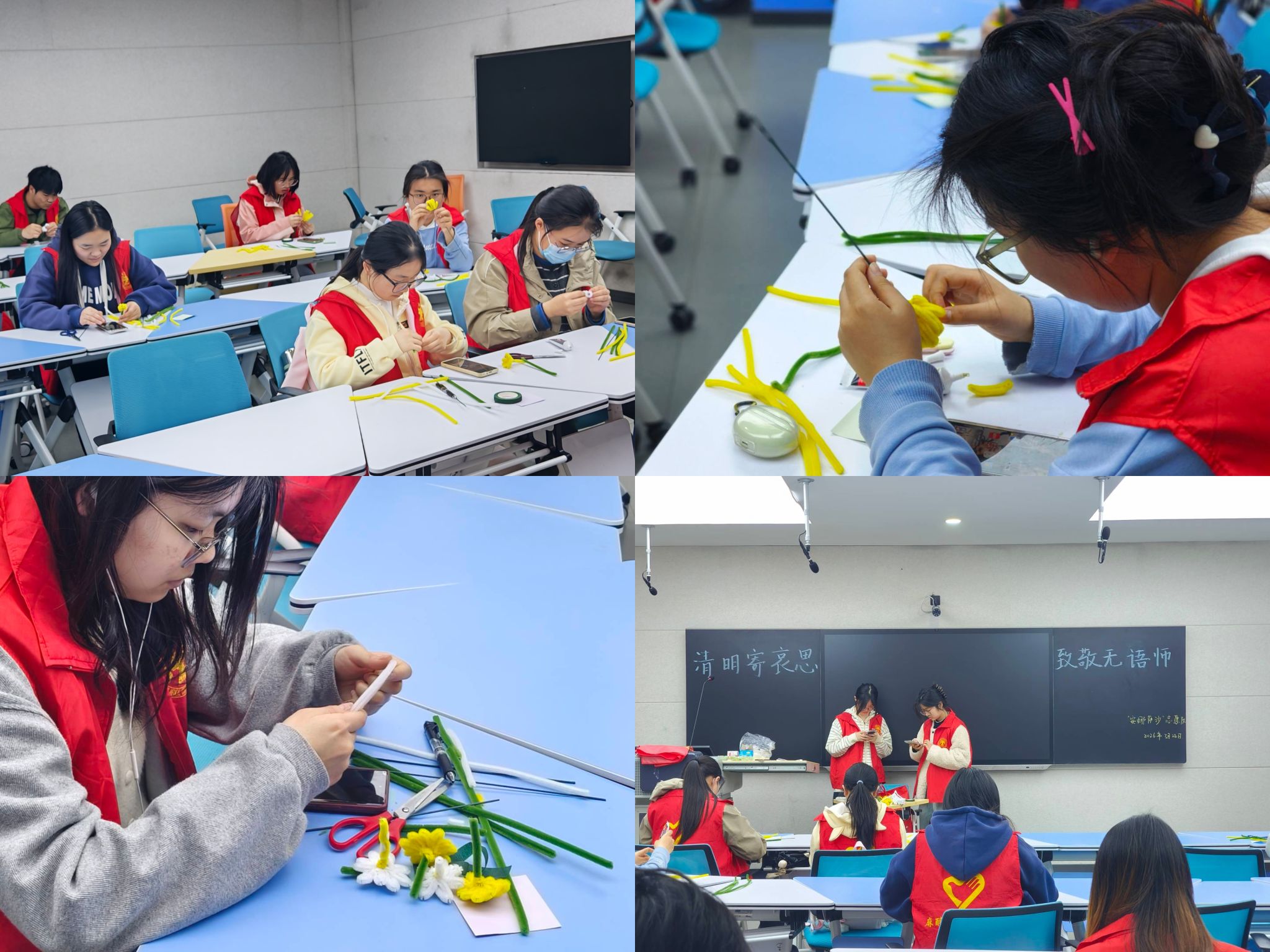 活动筹备精心,仪式感满满。活动开始前,同学们在教室集结,以扭扭棒为材,精心制作菊花、雏菊,提笔挥毫,将感恩与敬仰凝于手尖和笔端,写下真挚寄语,让缅怀之情更添温暖。