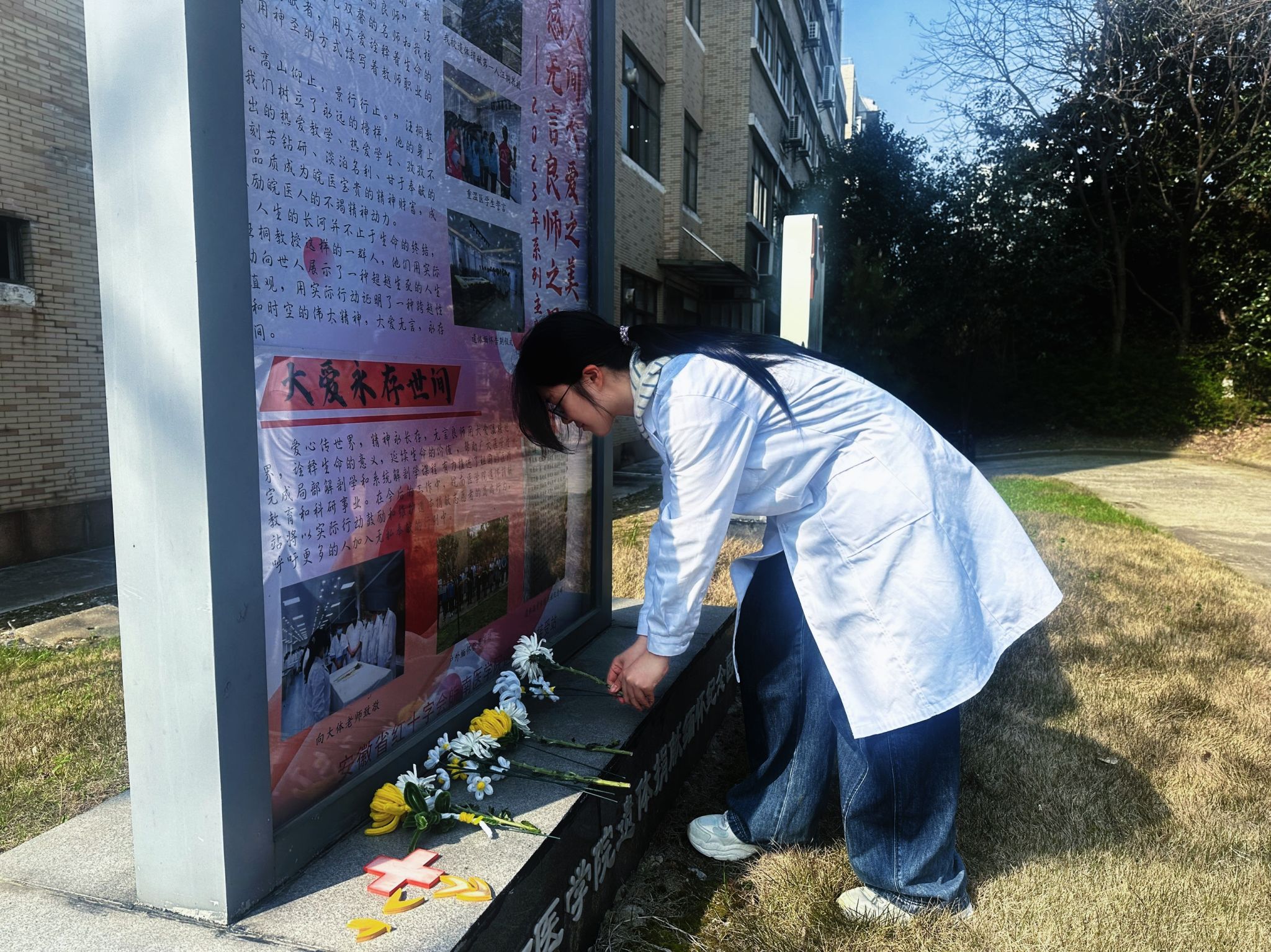 当天上午9时,同学们身着白大褂,在二号实验楼门口有序集合,进入二楼标本馆。馆内气氛庄重肃穆,大家手持亲手制作的扭扭棒花束,在标本陈列区前深深鞠躬,随后依次将花束摆放,以最质朴的方式表达对大体老师的感恩。