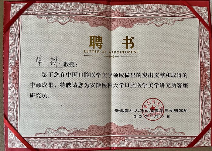 安徽省口腔医学会召开了《口腔美学文史馆》《口腔美学教育基地》专家论证会,安徽医科大学口腔医学院院长、安徽省口腔医学会会长何家才教授主持会议,中华口腔医学会口腔美学专委会主任委员、福建医科大学口腔医学院院长陈江教授到会指导,来自国内的口腔医学院校和新加坡国立大学牙学院、澳大利亚皇家口腔医学院旳16位教授出席会议。柴琳教授作为特邀专家参加了此次论证,并被聘为安徽医科大学口腔医学美学研究所客座研究员。