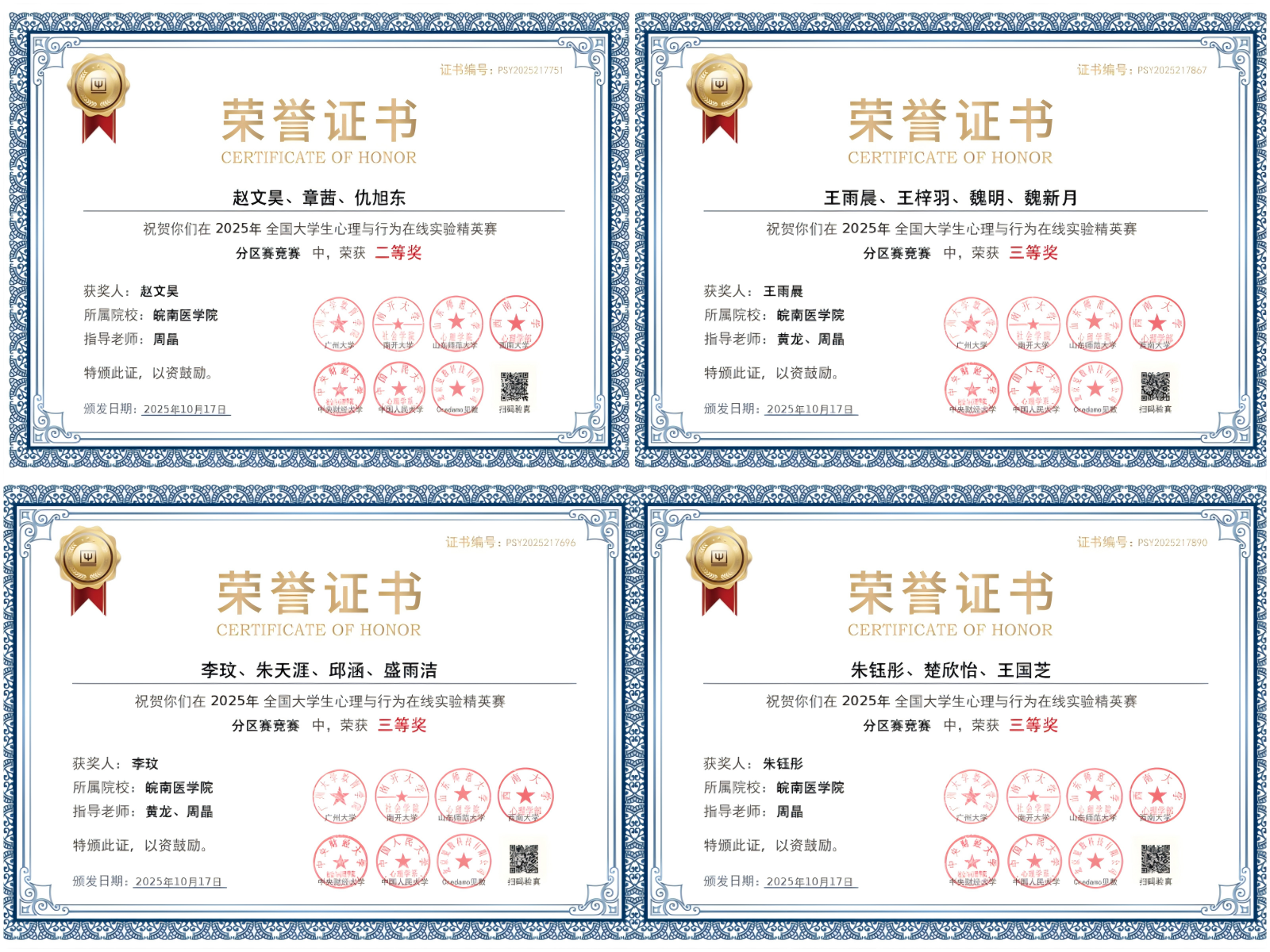 经过激烈而紧张的角逐,最终,我校学子凭借扎实的专业知识和出色的实践能力,取得了优异成绩。其中,2023级基础医学专业赵文昊(辅修应用心理学专业)团队的作品《负性情绪启动对医学生医疗风险决策的影响及疼痛共情能力的调节作用》,凭借其独特的研究视角和深入的分析,获二等奖。同时,2024级应用心理学专业王雨晨团队的作品《贫困感对网络去抑制行为的影响及其机制:基于认知资源有限理论》、2024级应用心理学专业朱钰彤团队的作品《不同表象能力个体在视觉工作记忆任务中的感觉运动策略使用》,以及2023级预防医学李玟(辅修应用心理学专业)团队的作品《从“稀缺感”到“攻击性”:社会规范在大学生群体中的调节作用》,也凭借各自的创新性和研究价值,获三等奖。
