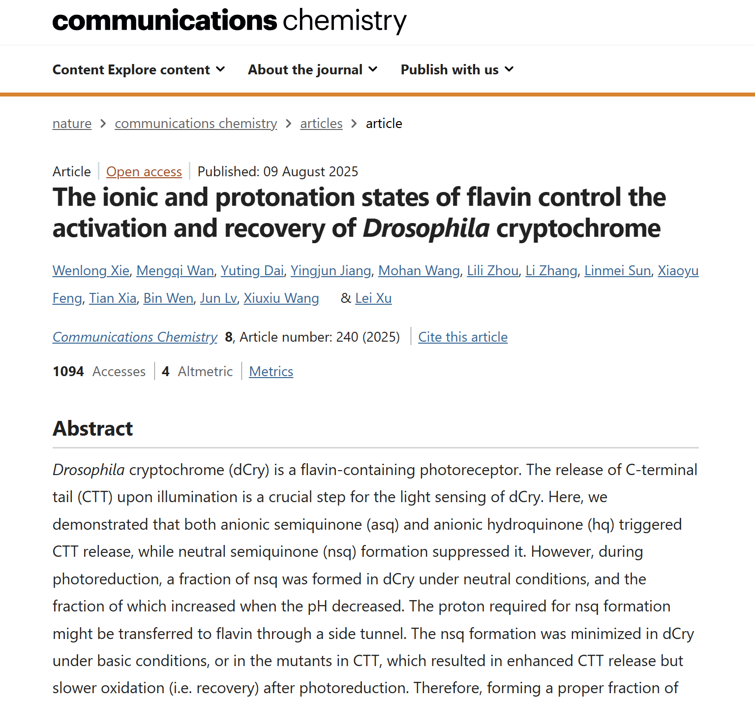 近日,基础医学院徐蕾教授团队在Nature子刊Communications Chemistry(IF = 6.2,中科院一区Top期刊)发表题为《The ionic and protonation states of flavin control the activation and recovery of Drosophila cryptochrome》的研究论文,阐释了果蝇生物钟蛋白隐色素的作用机制。我校2025届生物化学与分子生物学专业研究生谢文龙、2024届药物制剂专业本科生万梦琪(现为2025级药理学专业研究生)为共同第一作者,基础医学院教师王秀秀、徐蕾教授为通讯作者。