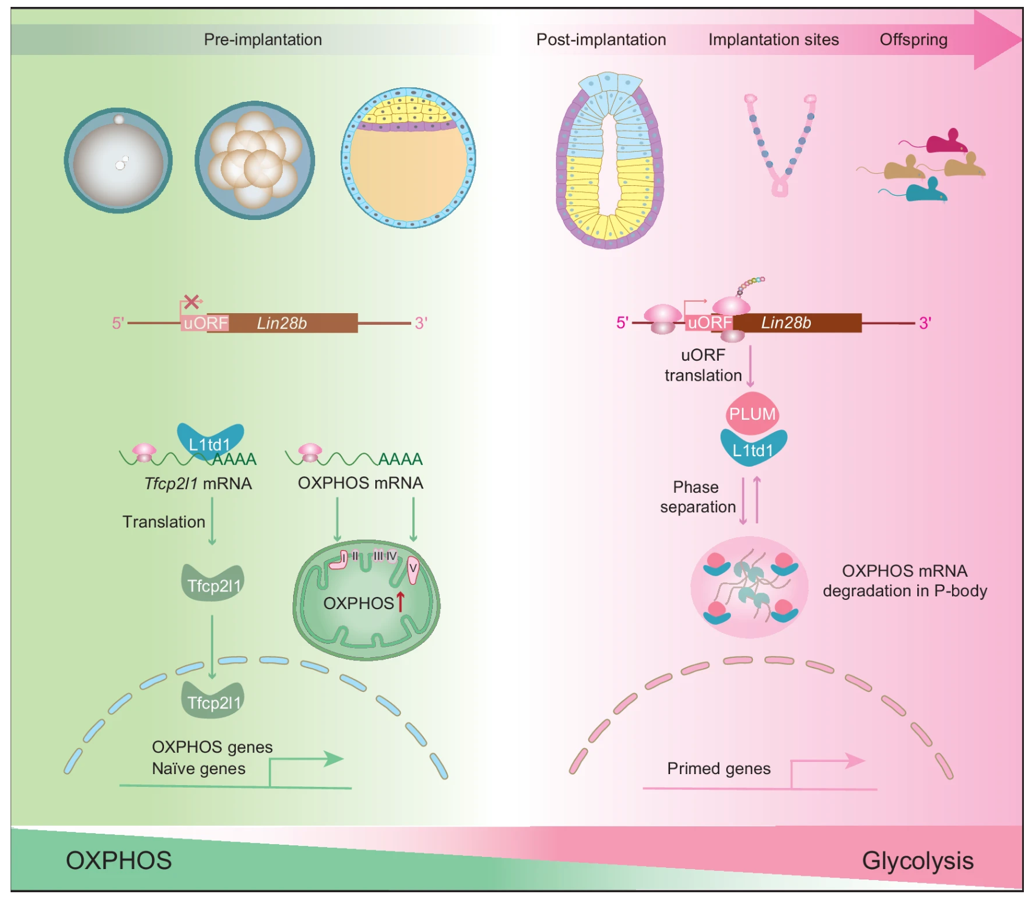 机制探索中,团队进行了时间序列的转录组分析,发现PLUM敲除改变了Naïve多能性基因表达的模式,加速了Naïve基因更均一的表达。值得注意的是,PLUM敲除使线粒体呼吸链复合物相关基因表达在转变早期骤然升高,表明线粒体代谢在其中起关键作用。进一步研究发现PLUM与RNA结合蛋白L1td1直接互作。L1td1在胞质中通过相分离形成点状凝聚体,而PLUM敲除会破坏这一结构,使L1td1聚集完全消失,并彻底改变其在多能性Primed-Naïve转换中的功能。接下来,团队利用eCLIP-seq分析发现PLUM敲除改变了L1td1结合的下游靶标,使L1td1特异结合Naïve多能性基因Tfcp2l1和Zfp42的mRNA,从而提高了它们的RNA稳定性。而Tfcp2l1可直接结合并激活Naïve和线粒体呼吸链复合物基因的表达。另一方面,PLUM敲除也破坏了细胞中负责 mRNA 降解的P颗粒,提示PLUM可能通过P颗粒组装调控线粒体呼吸功能。结合基因敲除小鼠及胚胎移植实验,研究团队发现PLUM的缺失会引发线粒体异常活化,最终导致胚胎着床率显著下降。