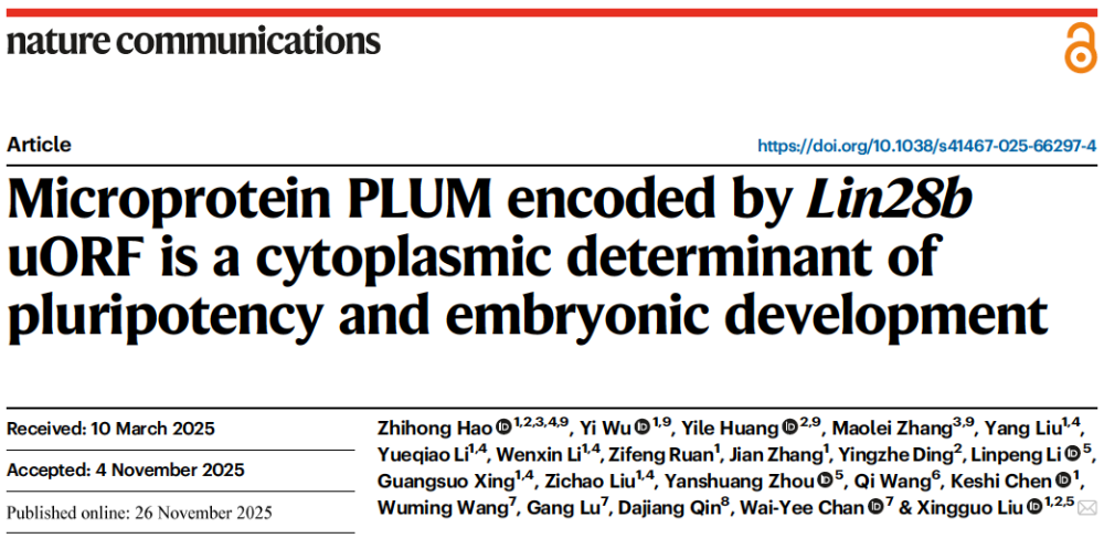 近日,我校特聘教授刘兴国团队在Nature Communications(IF=15.7,Nature子刊)上发表了题为《Microprotein PLUM encoded by Lin28b uORF is a cytoplasmic determinant of pluripotency and embryonic development》的研究论文,揭示了多能干细胞中首个由非经典阅读框编码的功能蛋白PLUM,在亚细胞水平连接无膜细胞器的RNA调控与线粒体代谢的翻译重塑,在多能性与胚胎发育中发挥关键的决定性作用。中国科学院广州生物医药与健康研究所、中国科学院香港科技创新研究院再生医学与健康研究中心、天府金城实验室前沿医学中心、皖南医学院等为本研究的共同作者单位,刘兴国教授为本研究的唯一通讯作者,基础医学院青年博士王琪作为文章署名作者参与该项研究工作。