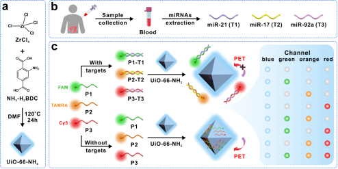 针对上述难题,研究团队合成出具有优异光学性能的氨基功能化锆基金属有机框架材料UiO-66-NH₂,并以此为载体构建了比率型荧光生物传感器。通过独特的探针设计与比率荧光技术,对肿瘤相关的三种miRNA(miRNA-21、miRNA-17、miRNA-92a)实现高灵敏度、高特异性检测。